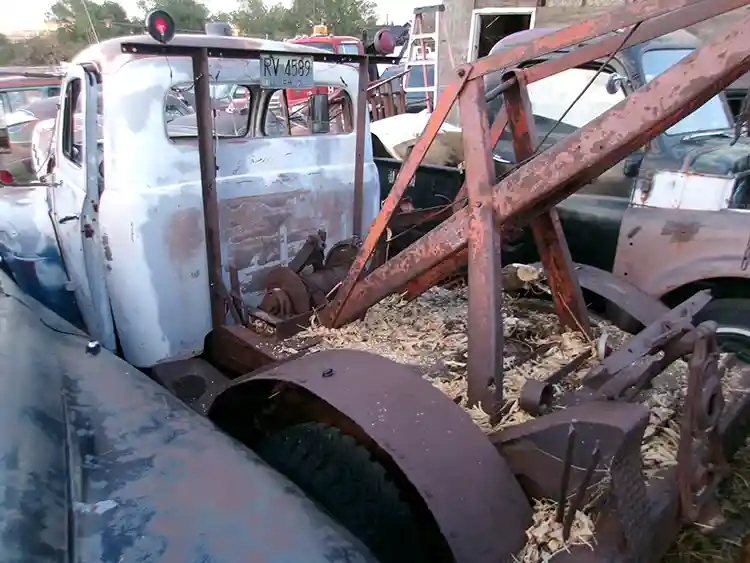 This antique tow truck is an American classic featuring a flathead V8 and the iconic cross piece connecting the headlights.