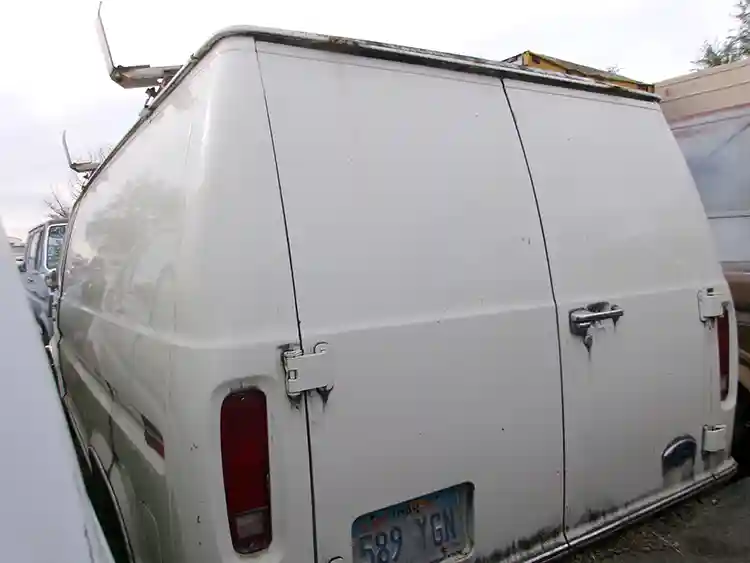 This utility van is enclosed with no back windows and shelving.